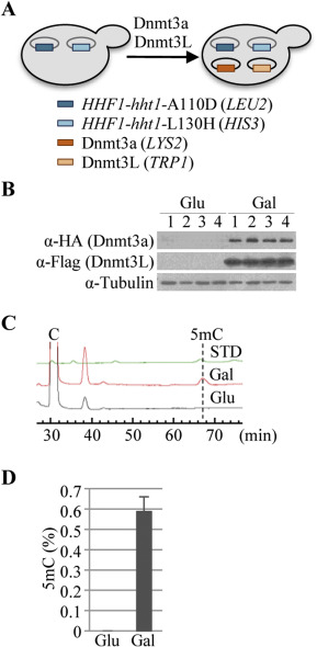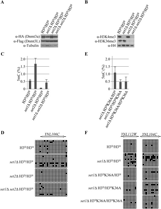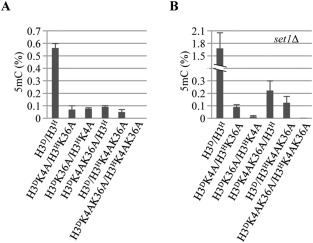 • A nucleosome contains two copies of each histone H2A, H2B, H3 and H4. Histone H3 K4me0 and K36me3 are two key chromatin marks forde novo DNA methylation catalyzed by DNA methyltransferases in mammals. However, it remains unclear whether K4me0 and K36me3 marks on both sister histone H3s regulate de novo DNA methylation independently or cooperatively. Here, taking advantage of the bivalent histone H3 system in yeast, we examined the contributions of K4 and K36 on sister histone H3s to genomic DNA methylation catalyzed by ectopically co-expressed murine Dnmt3a and Dnmt3L. The results show that lack of both K4me0 and K36me3 on one sister H3 tail, or lack of K4me0 and K36me3 on respective sister H3s results in a dramatic reduction of 5mC, revealing a synergy of two sister H3s in DNA methylation regulation. Accordingly, the Dnmt3a or Dnmt3L mutation that disrupts the interaction of Dnmt3aADD domain-H3K4me0, Dnmt3LADD domain-H3K4me0, or Dnmt3aPWWP domain-H3K36me3 causes a significant reduction of DNA methylation. These results support the model that each heterodimeric Dnmt3a-Dnmt3L reads both K4me0 and K36me3 marks on one tail of sister H3s, and the dimer of heterodimeric Dnmt3a-Dnmt3L recognizes two tails of sister histone H3s to efficiently execute de novo DNA methylation.