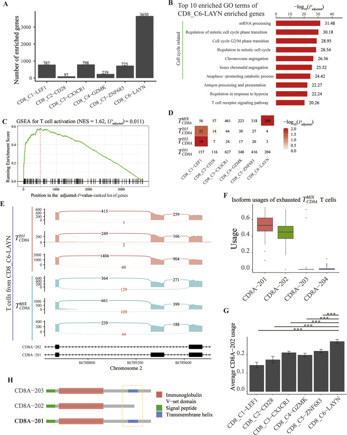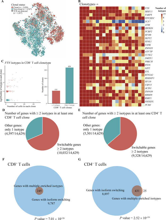 • Single-cell RNA sequencing (scRNA-seq) has enabled high-resolution characterization of molecular signatures of tumor-infiltrating lymphocytes. However, analyses at the transcript isoform level are rarely reported. As alternative splicing is critical to T-cell differentiation and activation, here, we proposed a computational method named IDEA (Isoform Detection, Enrichment, and functional Annotation) to comprehensively detect and annotate differentially used isoforms across cell subtypes. We applied IDEA on a scRNA-seq data set of 12,346 T cells from non-small-cell lung cancer (NSCLC). We found that most genes tend to dominantly express one isoform in single T cells, enabling typing T cells based on the isotypes, given a gene. Isotype analysis suggested that tumor-infiltrating T cells significantly preferred specific isotypes for 245 genes in CD8+ T cells and 456 genes in CD4+ T cells. Functional annotation suggests that the preferred isoforms involved in coding/noncoding switches, transcription start site changes, gains/losses of domains, and subcellular translocation. Clonal analysis revealed that isoform switching occurred during T-cell activation/differentiation. Our analysis provides precise characterization of the molecular events in tumor-infiltrating T cells and sheds new light on the regulatory mechanisms of tumor-infiltrating T cells.