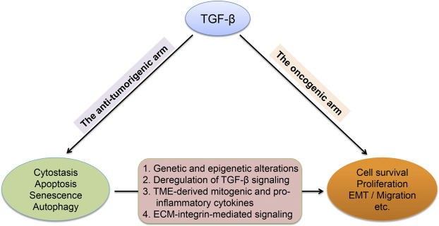 • Hepatocellular carcinoma (HCC) is the major form of primary liver cancer and one of the most prevalent and life-threatening malignancies globally. One of the hallmarks in HCC is the sustained cell survival and proliferative signals, which are determined by the balance between oncogenes and tumor suppressors. Transforming growth factor beta (TGF-β) is an effective growth inhibitor of epithelial cells including hepatocytes, through induction of cell cycle arrest, apoptosis, cellular senescence, or autophagy. The antitumorigenic effects of TGF-β are bypassed during liver tumorigenesis via multiple mechanisms. Furthermore, along with malignant progression, TGF-β switches to promote cancer cell survival and proliferation. This dichotomous nature of TGF-β is one of the barriers to therapeutic targeting in liver cancer. Thereafter, understanding the underlying molecular mechanisms is a prerequisite for discovering novel antitumor drugs that may specifically disable the growth-promoting branch of TGF-β signaling or restore its tumor-suppressive arm. This review summarizes how TGF-β inhibits or promotes liver cancer cell survival and proliferation, highlighting the functional switch mechanisms during the process.