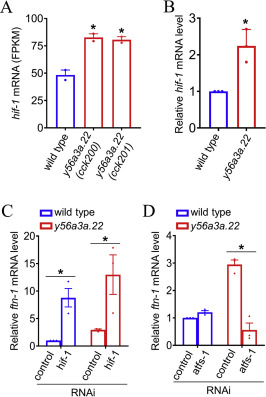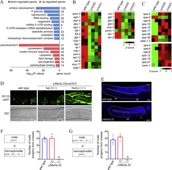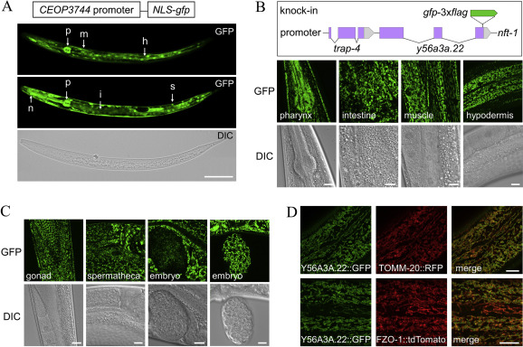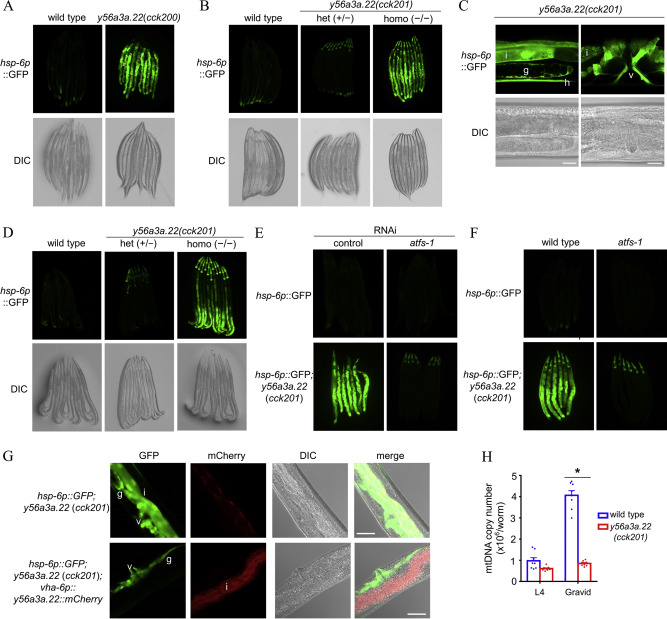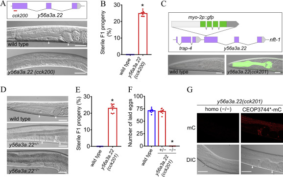 Mitochondria are the central hub for many metabolic processes, including the citric acid cycle, oxidative phosphorylation, and fatty acid oxidation. Recent studies have identified a new mitochondrial protein family, Fam210, that regulates bone metabolism and red cell development in vertebrates. The model organism Caenorhabditis elegans has a Fam210 gene, y56a3a.22, but it lacks both bones and red blood cells. In this study, we report that Y56A3A.22 plays a crucial role in regulating mitochondrial protein homeostasis and reproduction. The nematode y56a3a.22 is expressed in various tissues, including the intestine, muscle, hypodermis, and germline, and its encoded protein is predominantly localized in mitochondria. y56a3a.22 deletion mutants are sterile owing to impaired oogenesis. Loss of Y56A3A.22 induced mitochondrial unfolded protein response (UPRmt), which is mediated through the ATFS-1-dependent pathway, in tissues such as the intestine, germline, hypodermis, and vulval muscle. We further show that infertility and UPRmt induces by Y56A3A.22 deficiency are not attributed to systemic iron deficiency. Together, our study reveals an important role of Y56A3A.22 in regulating mitochondrial protein homeostasis and oogenesis and provides a new genetic tool for exploring the mechanisms regulating mitochondrial metabolism and reproduction as well as the fundamental role of the Fam210 family.