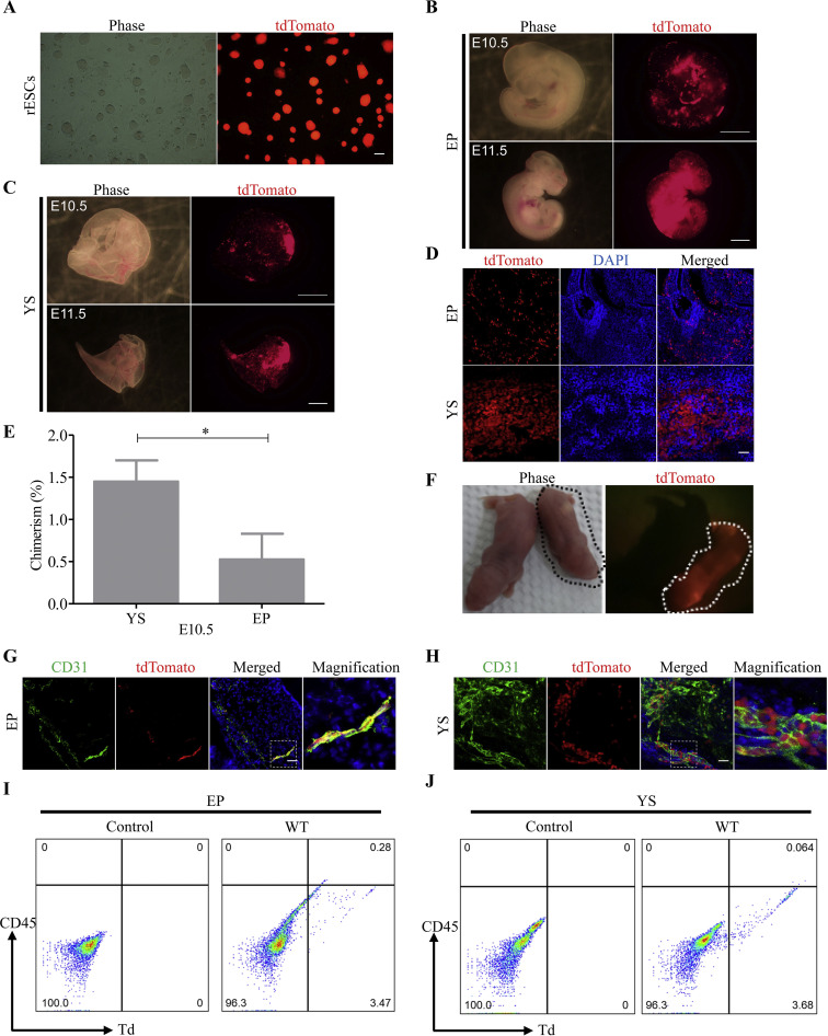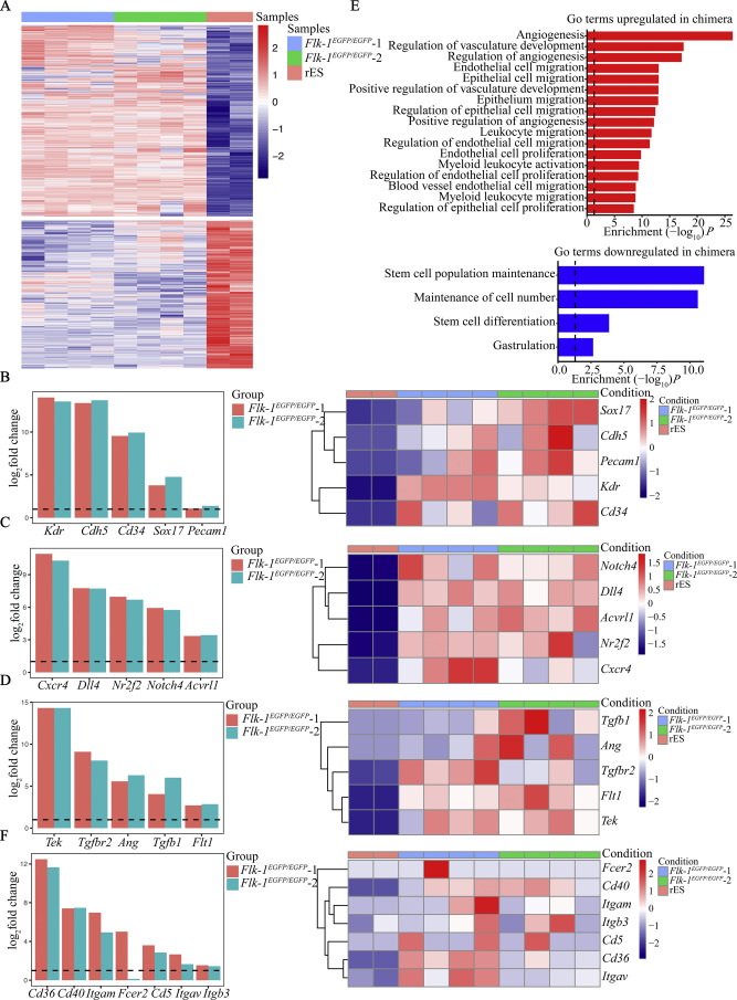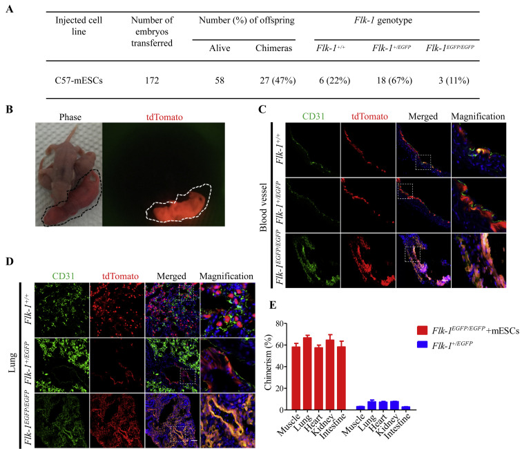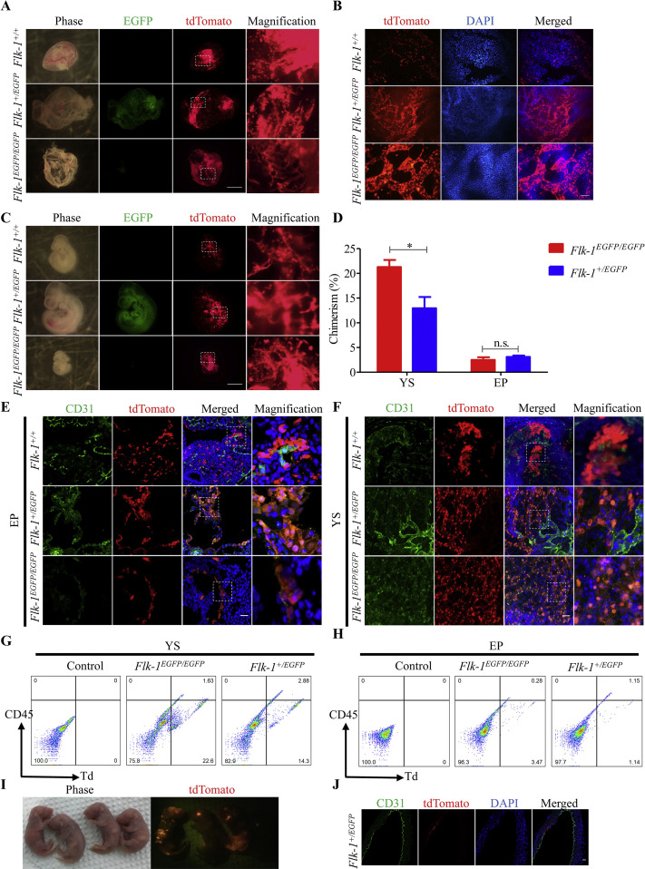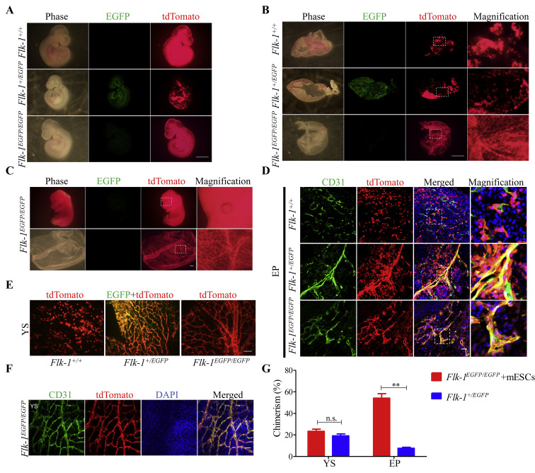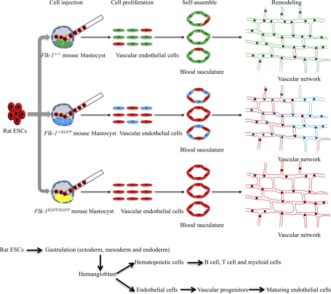 Interspecies chimera through blastocyst complementation could be an alternative approach to create human organs in animals by using human pluripotent stem cells. A mismatch of the major histocompatibility complex of vascular endothelial cells between the human and host animal will cause graft rejection in the transplanted organs. Therefore, to achieve a transplantable organ in animals without rejection, creation of vascular endothelial cells derived from humans within the organ is necessary. In this study, to explore whether donor xeno-pluripotent stem cells can compensate for blood vasculature in host animals, we generated rat-mouse chimeras by injection of rat embryonic stem cells (rESCs) into mouse blastocysts with deficiency of Flk-1 protein, which is associated with endothelial and hematopoietic cell development. We found that rESCs could differentiate into vascular endothelial and hematopoietic cells in the rat-mouse chimeras. The whole yolk sac (YS) of Flk-1 rat-mouse chimera was full of rat blood vasculature. Rat genes related to vascular endothelial cells, arteries, and veins, blood vessels formation process, as well as hematopoietic cells, were highly expressed in the YS. Our results suggested that rat vascular endothelial cells could undergo proliferation, migration, and self-assembly to form blood vasculature and that hematopoietic cells could differentiate into B cells, T cells, and myeloid cells in rat-mouse chimeras, which was able to rescue early embryonic lethality caused byFlk-1 deficiency in mouse.