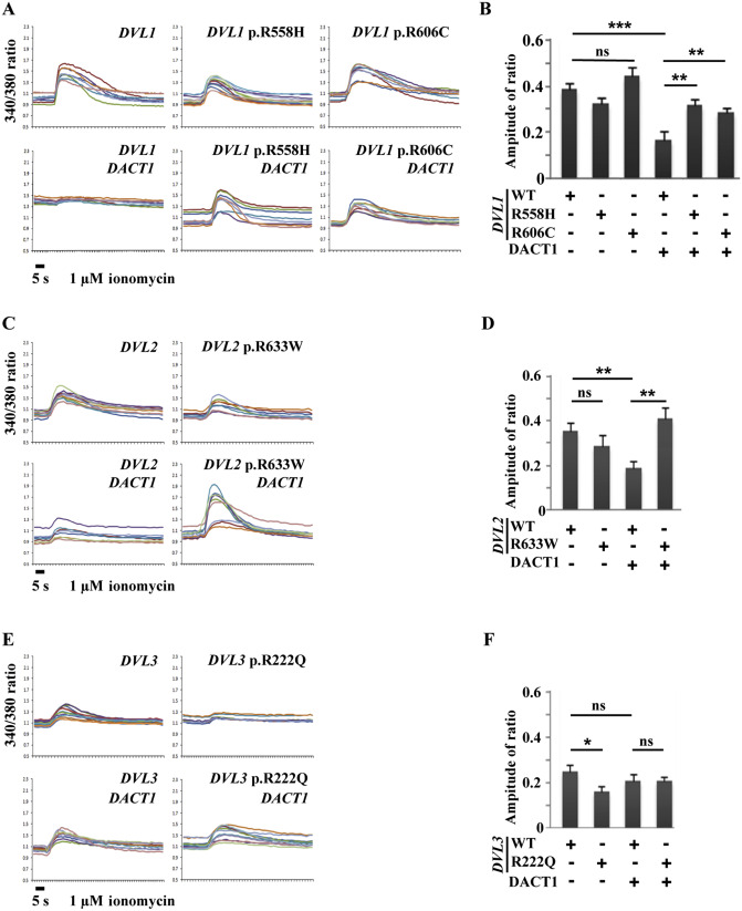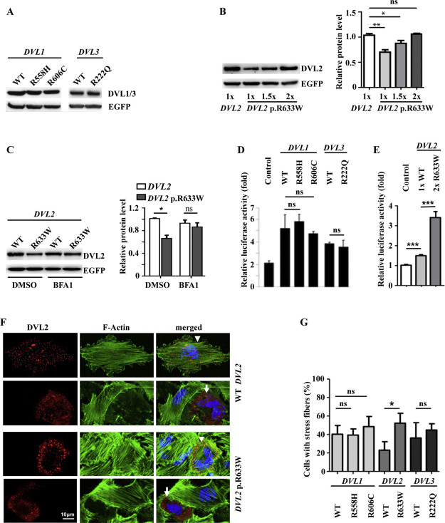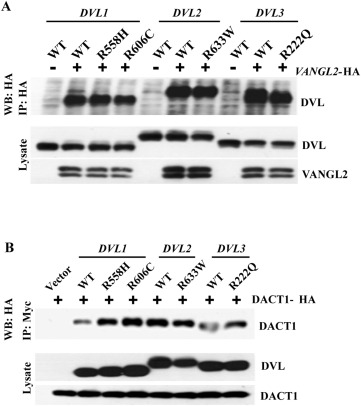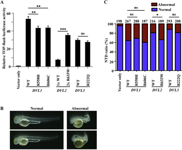 Wnt signaling pathways, including the canonical Wnt/β-catenin pathway, planar cell polarity pathway, and Wnt/Ca2+ signaling pathway, play important roles in neural development during embryonic stages. The DVL genes encode the hub proteins for Wnt signaling pathways. The mutations in DVL2 and DVL3 were identified from patients with neural tube defects (NTDs), but their functions in the pathogenesis of human neural diseases remain elusive. Here, we sequenced the coding regions of three DVL genes in 176 stillborn or miscarried fetuses with NTDs or Dandy-Walker malformation (DWM) and 480 adult controls from a Han Chinese population. Four rare mutations were identified: DVL1 p.R558H, DVL1 p.R606C, DVL2 p.R633W, and DVL3 p.R222Q. To assess the effect of these mutations on NTDs and DWM, various functional analyses such as luciferase reporter assay, stress fiber formation, and in vivo teratogenic assay were performed. The results showed that the DVL2 p.R633W mutation destabilized DVL2 protein and upregulated activities for all three Wnt signalings (Wnt/β-catenin signaling, Wnt/planar cell polarity signaling, and Wnt/Ca2+ signaling) in mammalian cells. In contrast, DVL1 mutants (DVL1 p.R558H and DVL1 p.R606C) decreased canonical Wnt/β-catenin signaling but increased the activity of Wnt/Ca2+ signaling, and DVL3 p.R222Q only decreased the activity of Wnt/Ca2+ signaling. We also found that only the DVL2 p.R633W mutant displayed more severe teratogenicity in zebrafish embryos than wild-type DVL2. Our study demonstrates that these four rare DVL mutations, especially DVL2 p.R633W, may contribute to human neural diseases such as NTDs and DWM by obstructing Wnt signaling pathways.