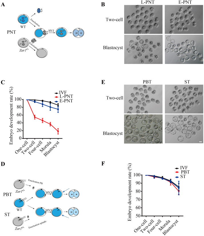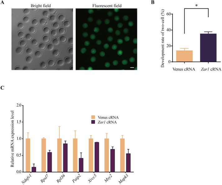 Poor oocyte quality is associated with early embryo developmental arrest and infertility. Maternal gene plays crucial roles in the regulation of oocyte maturation, and its mutation is a common cause of female infertility. However, how to improve oocyte quality and develop effective therapy for maternal gene mutation remains elusive. Here, we use Zar1 as an example to assess the feasibility of genome transfer to cure maternal gene mutation–caused female infertility. We first discover that cytoplasmic deficiency primarily leads to Zar1-null embryo developmental arrest by disturbing maternal transcript degradation and minor zygotic genome activation (ZGA) during the maternal-zygotic transition. We next perform genome transfer at the oocyte (spindle transfer or polar body transfer) and zygote (early pronuclear transfer or late pronuclear transfer) stages to validate the feasibility of preventing Zar1 mutation–caused infertility. We finally demonstrate that genome transfer either at the oocyte or at the early pronuclear stage can support normal preimplantation embryo development and produce live offspring. Moreover, those pups grow to adulthood and show normal fertility. Therefore, our findings provide an effective basis of therapies for the treatment of female infertility caused by maternal gene mutation.