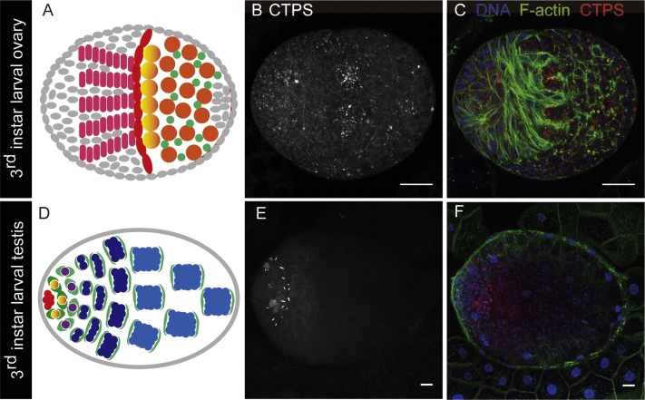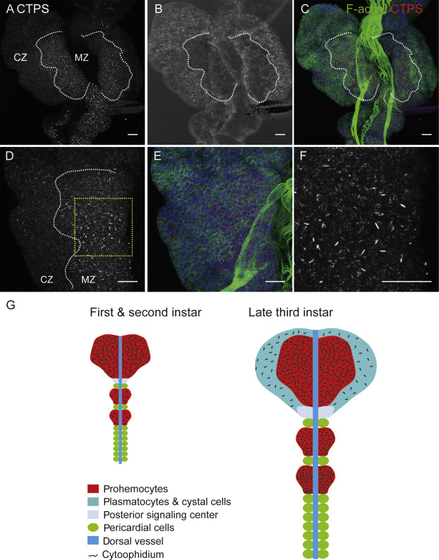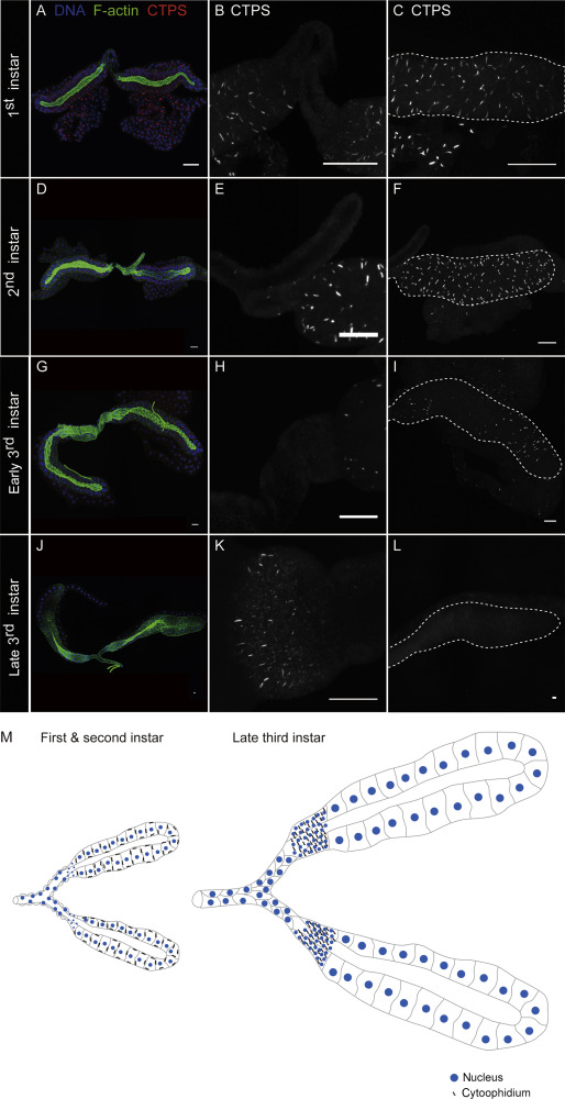 In 2010, cytidine 5′-triphosphate synthase (CTPS) was reported to form the filamentous or serpentine structure in Drosophila, which we termed the cytoophidium. In the last decade, CTPS filaments/cytoophidia have been found in bacteria, budding yeast, human cells, mice, fission yeast, plants, and archaea, indicating that this mechanism is highly conserved in evolution. In addition to CTPS, other metabolic enzymes have been identified to have the characteristics of forming cytoophidia or similar advanced structures, demonstrating that this is a basic strategy of cells. Nevertheless, our understanding of the physiological function of the cytoophidium remains incomplete and elusive. Here, we took the larva of Drosophila melanogaster as a model to systematically describe the localization and distribution of cytoophidia in different tissues during larval development. We found that the distribution pattern of CTPS cytoophidia is dynamic and heterogenic in larval tissues. Our study provides a road map for further understanding of the function and regulatory mechanism of cytoophidia.